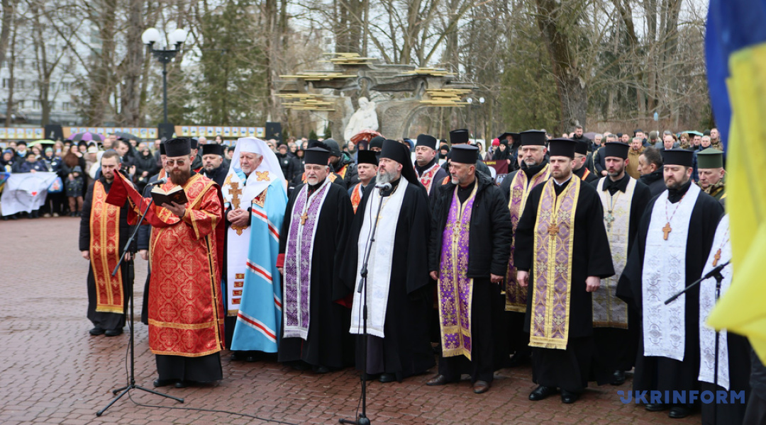 У Вінниці на площі Тараса Шевченка відбулася спільна міжконфесійна молитва та урочисте покладання квітів до пам’ятного знаку Небесній Сотні та загиблим Героям у російсько-українській війні.