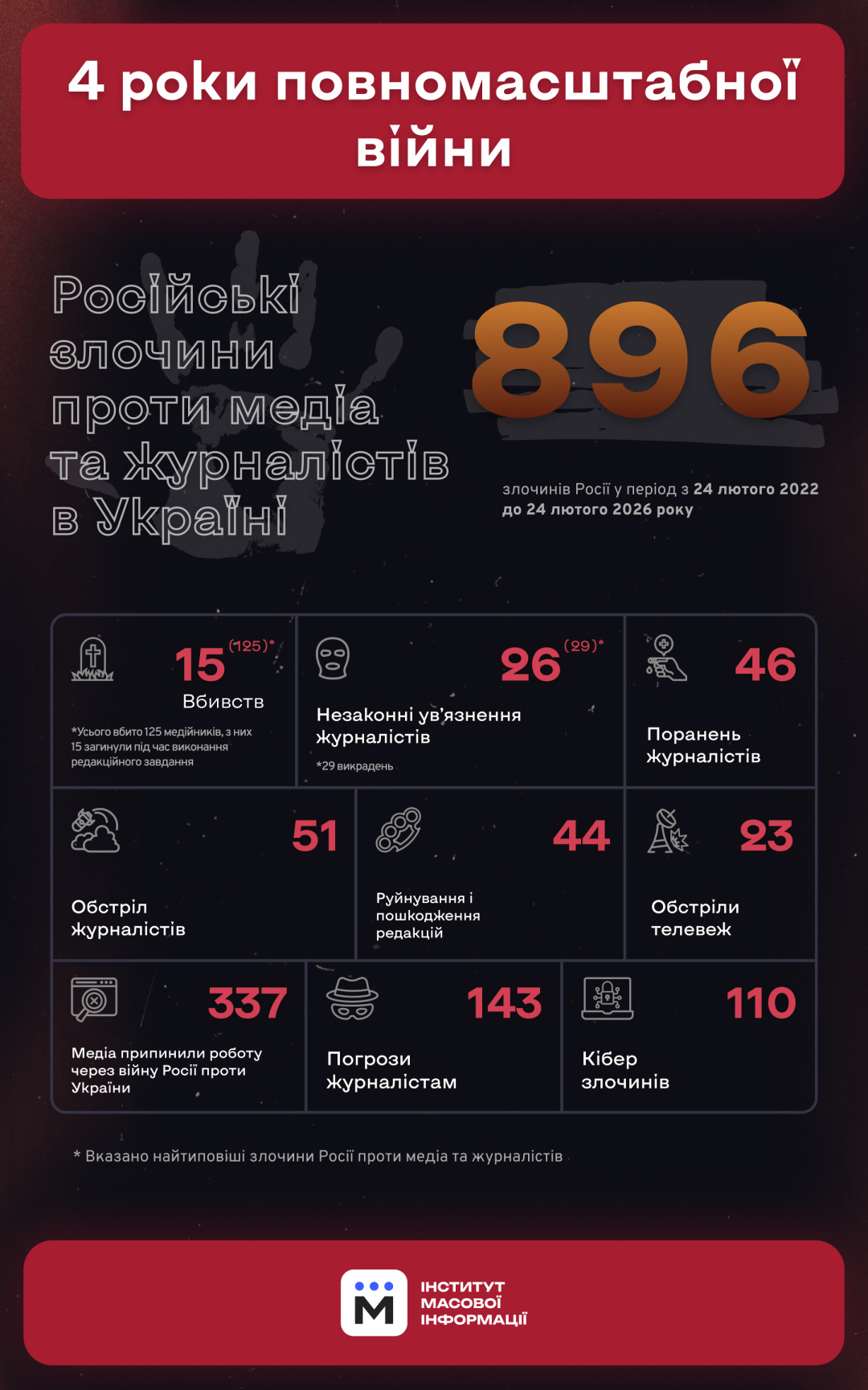 За даними Моніторингу, за чотири роки з початку повномасштабного вторгнення Росія скоїла 896 злочинів проти журналістів та медіа в Україні. Серед основних російських злочинів проти журналістів та медіа, які скоєні на українській території: вбивства журналістів - 125 (з них 15 - під час виконання професійних обовʼязків, 96 загинули як учасники бойових дій та 14 – як цивільні жертви російських обстрілів або катувань); 26 випадків незаконного ув’язнення журналістів; переслідування, погрози та залякування журналістів – 143; руйнування та пошкодження офісів редакцій – 44; обстріли телевеж – щонайменше 23; вимкнення українського мовлення та запуски на базі українських медіа російської пропаганди – 35; кіберзлочини – 110. Крім того, відбулося закриття 337 медіа внаслідок фінансової та кадрової кризи, спричиненої повномасштабною російською агресією.