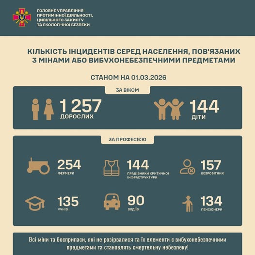 «Станом на 1 березня 2026 року через ворожі міни та вибухонебезпечні залишки війни постраждала 1 401 особа, з яких діти – 144, дорослі - 1 257», - ідеться у повідомленні.