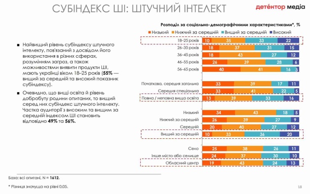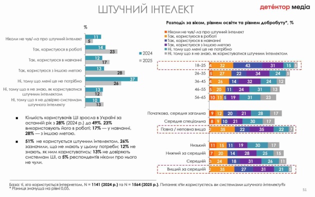 "Кількість користувачів ШІ зросла в Україні за останній рік з 28% (2024 р.) до 49%. 23% використовують його в роботі, 17% - у навчанні, 28% - з іншою метою. 51% не користується штучним інтелектом", - йдеться у дослідженні.