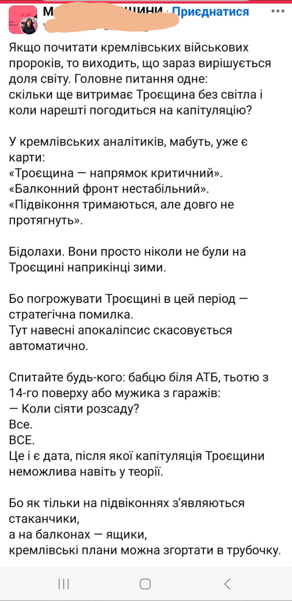 Пік обстрілів столиці, пік морозів. Вистигаюча 500-тисячна Троєщина і раптом – допис Віри Будлик: «Якщо почитати кремлівських військових пророків, то виходить, що зараз вирішується доля світу. Головне питання одне: скільки ще витримає Троєщина без світла і коли нарешті погодиться на капітуляцію? Бідолахи. Вони просто ніколи не були на Троєщині наприкінці зими. Бо погрожувати Троєщині в цей період – стратегічна помилка.Тут навесні апокаліпсис скасовується автоматично.