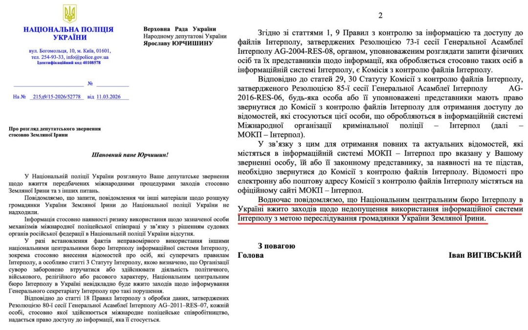 «Водночас повідомляємо, що Національним центральним бюро Інтерполу в Україні вжито заходів щодо недопущення використання інформаційної системи Інтерполу з метою переслідування громадянки України Земляної Ірини», — додали правоохоронці.