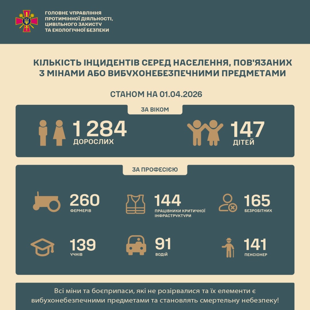 "Станом на 01.04.2026 від початку повномасштабного вторгнення рф в Україну через ворожі міни та вибухонебезпечні залишки війни постраждало 1 431 особа, з яких діти - 147, дорослі - 1 284", - йдеться у повідомленні.