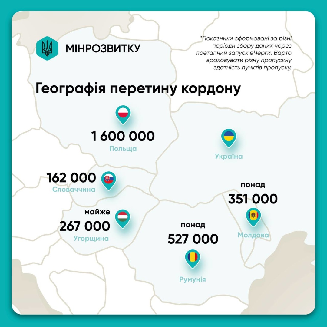 Найбільше навантаження зафіксовано на кордоні з Польщею, де здійснено 1,6 млн перетинів. Значні показники також демонструють напрямки з Румунією (понад 527 тис.), Молдовою (понад 351 тис.), Угорщиною (майже 267 тис.) та Словаччиною (162 тис. перетинів).