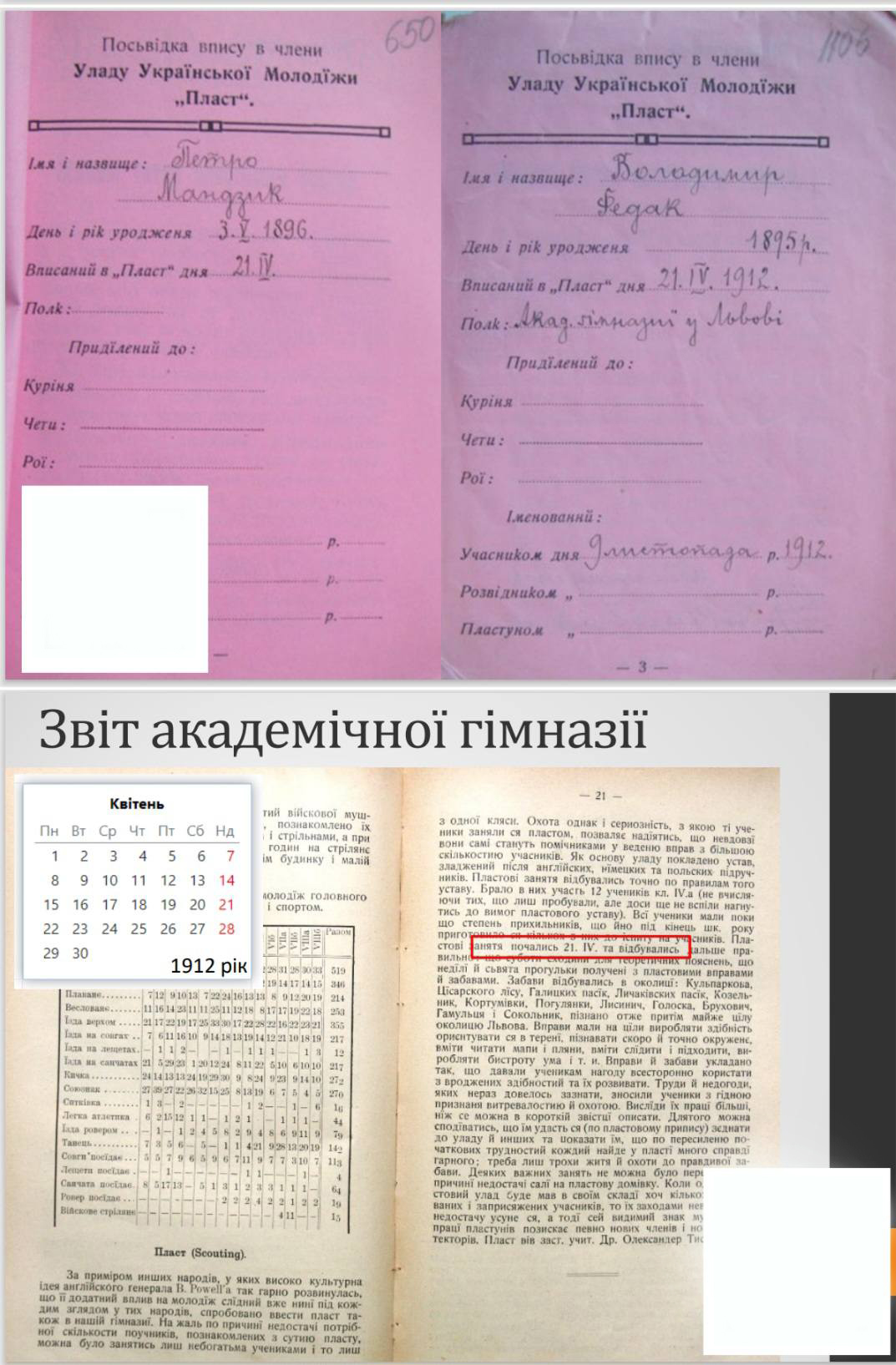 - Шлях до віднайдення правди був довгим. За часів СРСР архіви були закриті, і лише після відкриття фондів СБУ за президентства Ющенка дослідники отримали доступ до першоджерел. Ми ще у 2011 році підозрювали, що з датою щось не так. Почали досліджувати календарці (специфічна назва невеликих кишенькових календарів, надзвичайно популярних у Галичині наприкінці XIX – на початку XX ст., – ред.) та записи гімназій. У власноруч написаному «Календарці» Тисовського, а також у звітах Академічної гімназії у Львові зафіксовано: перші публічні сходини, на яких гуртки отримали посвідки та вписалися в організацію, відбулися 21 квітня 1912 року.