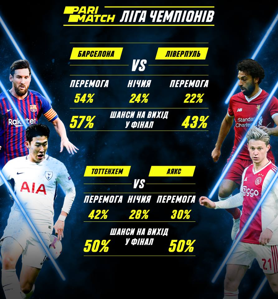 Перед початком протистояння аналітики Parimatch оцінюють шанси «Тоттенгема» і «Аякса» на вихід у фінал як рівні. Що ж стосується найближчого матчу, то тут перевага на боці англійців - 42% на перемогу проти 30% у «Аякса» (і 28% на нічию).