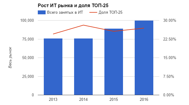 Рік тому вдалося нарахувати 89 300 фахівців, що працюють в українському IT. Виходить, що за 2016 індустрія виросла на 12%.