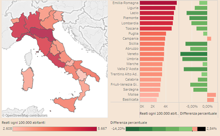 У звіті також подано графіки, де можна наочно побачити повну картину найбільш небезпечних і безпечних провінцій Італії. Так зелений колір означає зниження приступности, рожевий - її збільшення в певних регіонах. Цифри вказують на кількість злочинів на 100 000 душ населення.