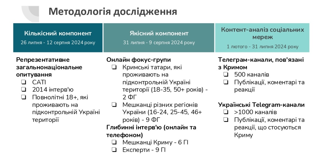 Воно містило різні підходи – якісні та кількісні методи збору даних, що дало змогу охопити широкий спектр тем і думок. Його автори провели 11 фокус-груп, 15 глибинних інтерв’ю, опитали 2014 респондентів, які проживають на підконтрольній уряду України території. Також в межах дослідження провели моніторинг телеграм-каналів, пов’язаних з Кримом.