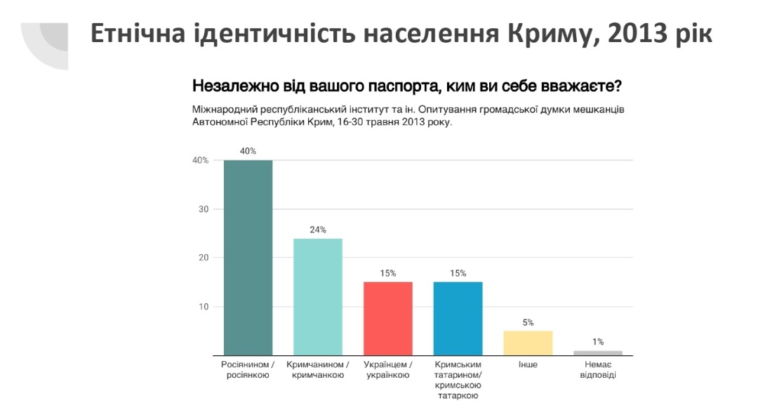 Тодішні результати соціологічного опитування спростовували твердження російської пропаганди про те, що Крим є «форпостом, який стоїть на сторожі російських інтересів». Зокрема, у 2013 році 40% кримчан відповіли соціологам, що відчувають себе росіянами, 24% – кримчанами, 15% – кримськими татарами, 15% – українцями, 5% обрали іншу ідентичність, а 1% опитаних відмовилися відповідати на це питання.