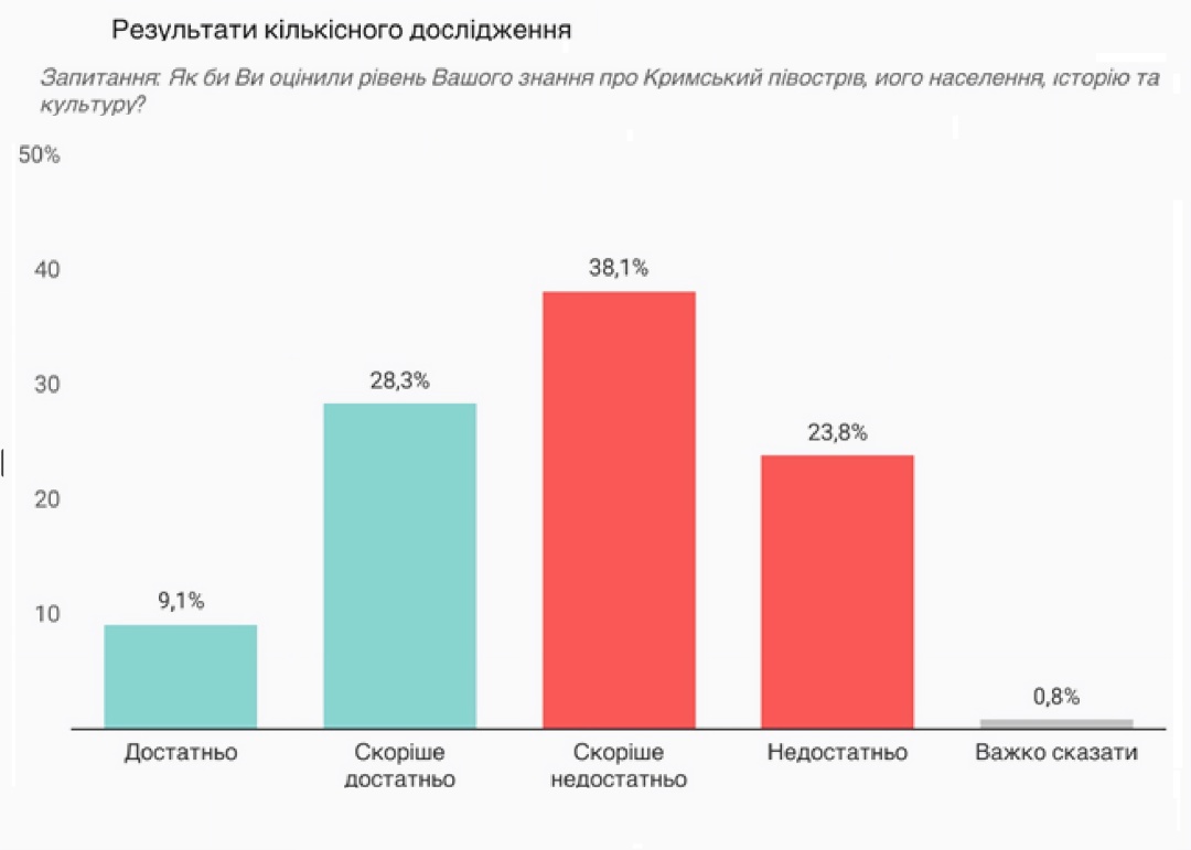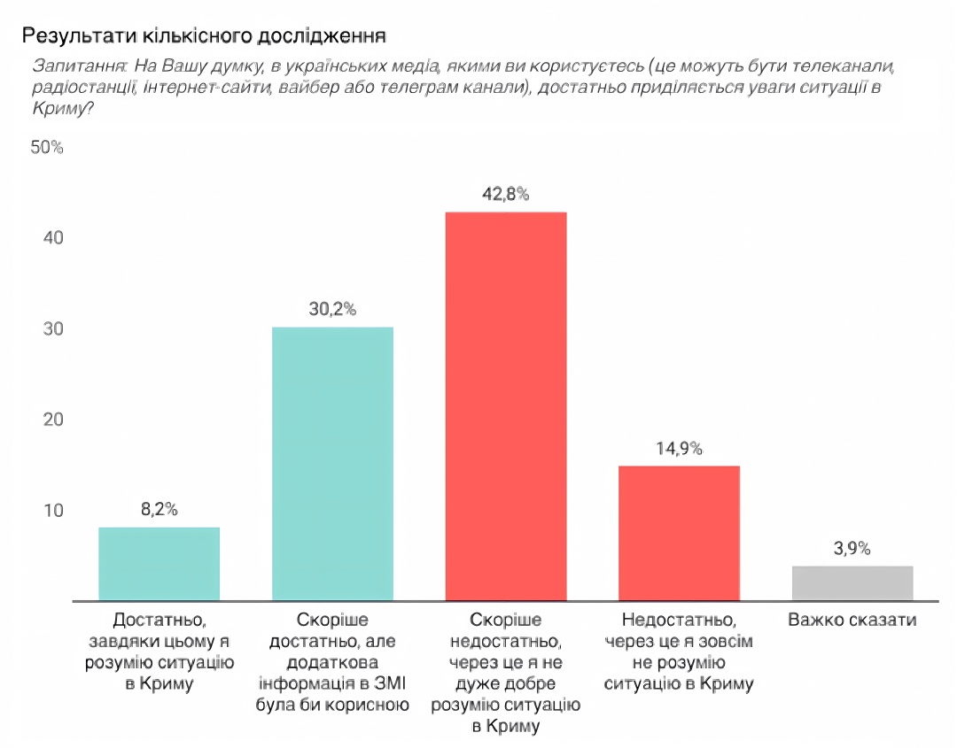 Лише 8% опитаних респондентів відповіли, що ЗМІ повністю добре висвітлюють питання Криму. 9% вважають себе особисто добре поінформованими.