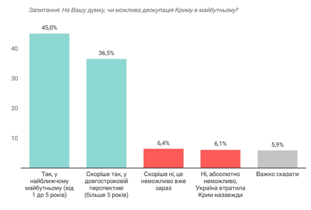 Віру в деокупацію Криму протягом найближчих п’яти років висловлює майже половина респондентів, причому молодь менш оптимістична в короткостроковій перспективі, ніж старші люди.