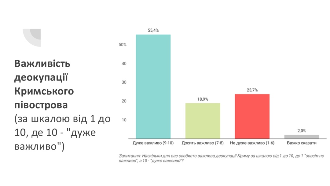 Він звернув увагу, що 94% українців погоджуються із твердженням, що Крим має бути повернутий під контроль України. Лише дуже невелика частина українського суспільства прихильна до тез російської пропаганди і має відмінну думку. Це також простежується в інших соціологічних дослідженнях. 55,4% респондентів відповіли, що звільнення Криму для них особисто є дуже важливим, 18,9% – досить важливим, 23,7% – не дуже важливим і 2% не визначилися у цьому питанні.