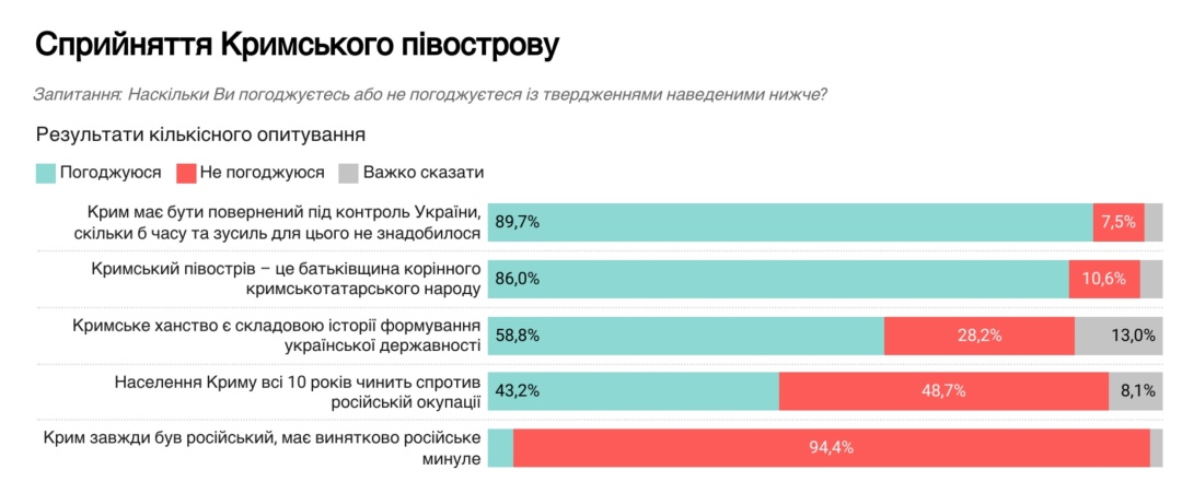Комплексне соціологічне дослідження Київського міжнародного інституту соціології (КМІС) показало, що за десять років окупації українське суспільство зберегло чітку позицію щодо приналежності Криму до України, але готове до виваженого підходу в питаннях реінтеграції. Попри те, що майже половина українців вірять у деокупацію протягом найближчих п’яти років, більшість усвідомлює складність цього процесу.