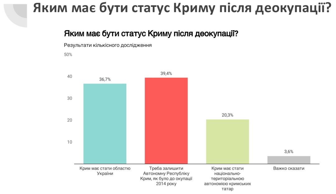 36,7% опитаних респондентів вважають, що після звільнення Крим має стати областю України. 39,4% виступають за те, щоб все було так, як до військової операції РФ із захоплення півострова, тобто щоб була Автономна Республіка Крим. 20,3% підтримують ідею національної територіальної автономії кримських татар. 3,6% відмовилися поділитися своїм баченням.