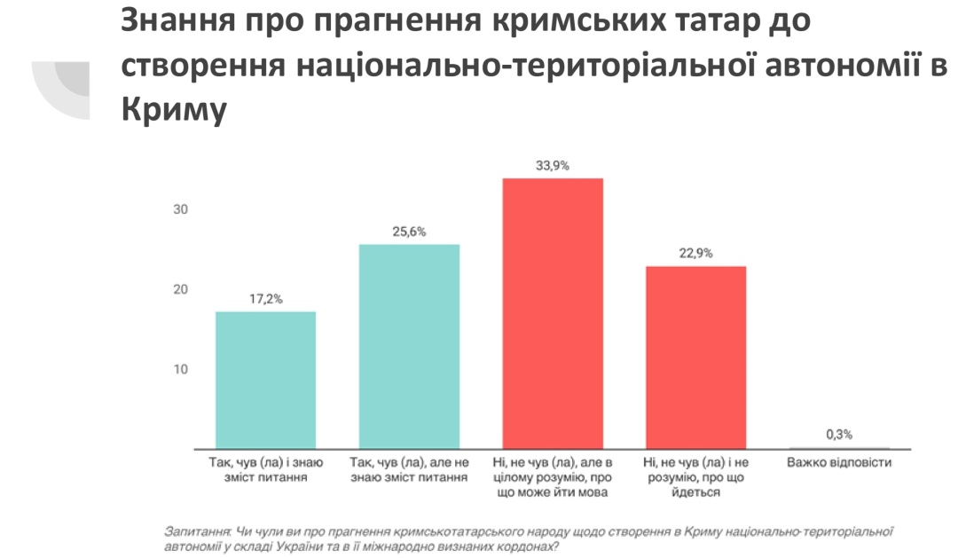 Соціологи також поцікавилися в українців, чи знають вони про концепцію кримськотатарської національної автономії. Лише 17,2% українців добре про це поінформовані. Багато людей щось чули про це або можуть здогадуватись, про що йдеться. І майже 23% респондентів нічого не знають про цю концепцію. Тобто загалом ця концепція малозрозуміла пересічним українцям.