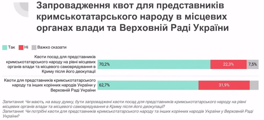 Понад 70% українців вважають, що мають бути запроваджені квоти для представників кримськотатарського народу на рівні місцевих органів влади та місцевого самоврядування в Криму після його деокупації. Ба більше, 62,7% опитаних громадян упевнені, що квоти мають бути і на рівні Верховної Ради України.