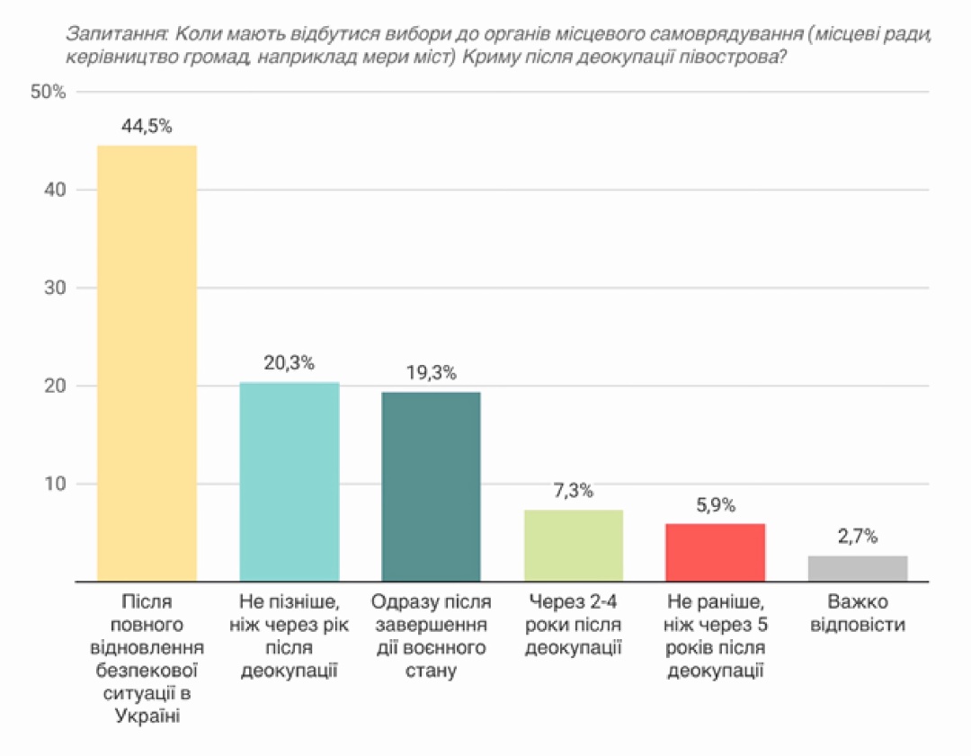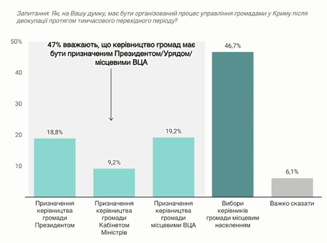 Соціологи також поставили запитання громадянам, чи має після деокупації місцева влада на півострові призначатися, чи там мають відбутися місцеві вибори.