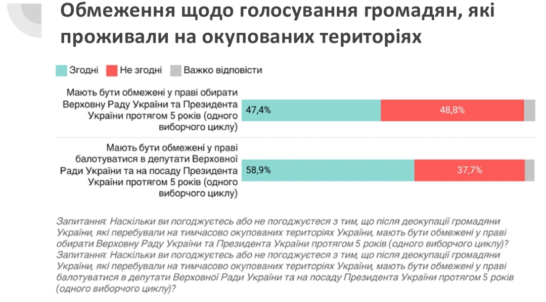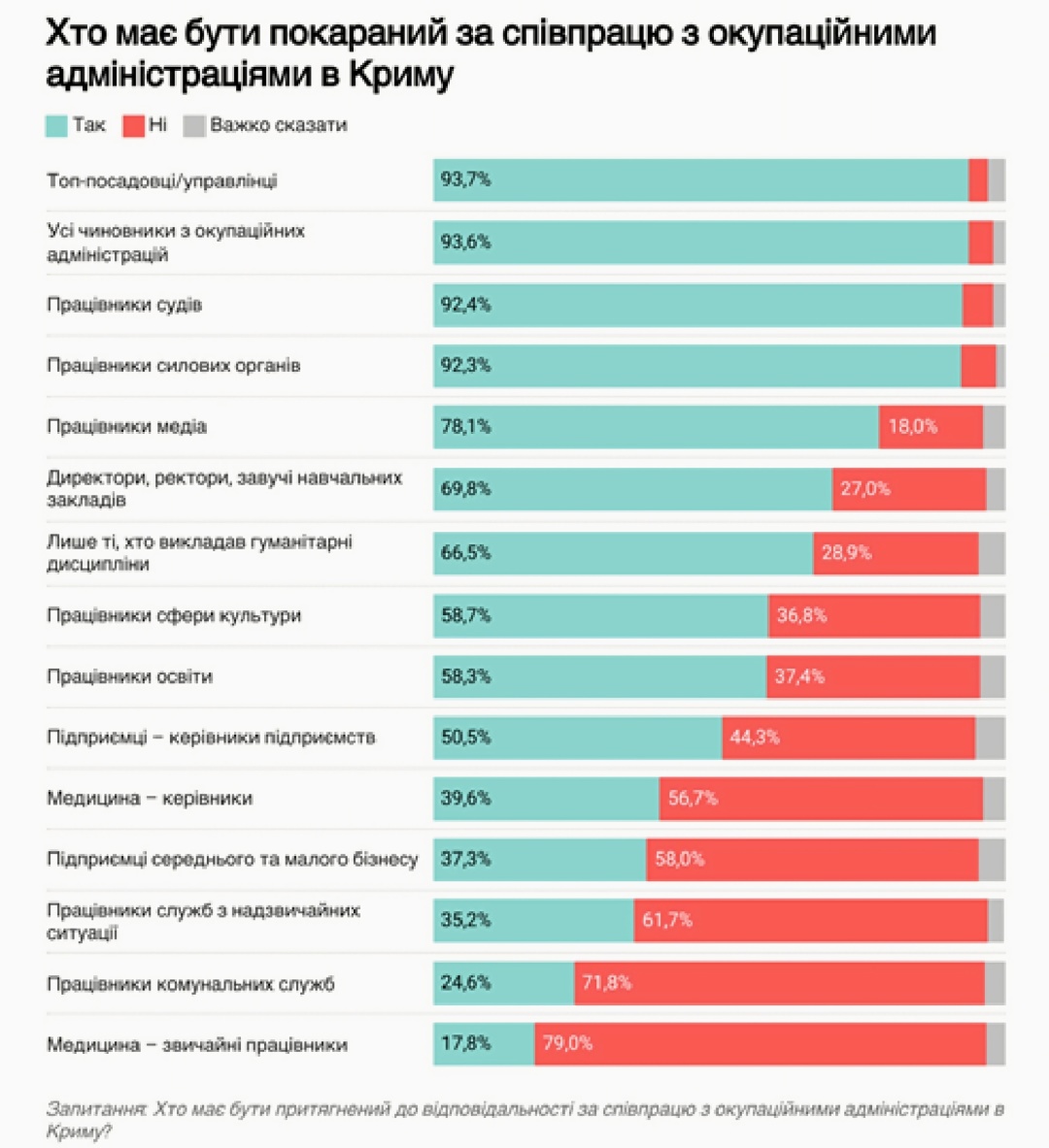 Соціологи протестували ставлення українців до різних видів діяльностей в окупації. Більшість жителів материкової частини України підтримують суворе покарання для чиновників, незаконних «суддів», силовиків та працівників медіа, які співпрацюють з окупаційною адміністрацією. Проте щодо працівників служб надзвичайних ситуацій і комунальників, то більшість виступає проти покарань. Щодо підприємців і медиків, то значна частина респондентів вважають, що їх не слід карати, особливо, якщо йдеться про звичайних працівників.
