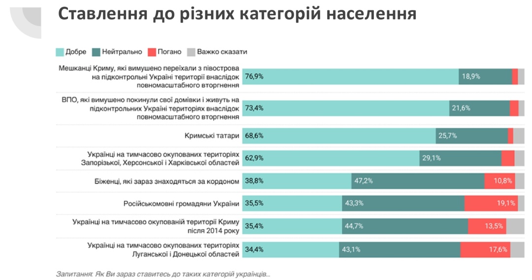 34–39% позитивно ставляться до біженців за кордоном, російськомовних громадян та українців під окупацією в Криму та на Донбасі.