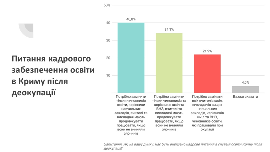 Лише 22% мешканців материкової частини України виступають за повну заміну всіх вчителів, керівників закладів та чиновників від освіти. На противагу цьому, 34% пропонують звільнити лише керівників закладів освіти і чиновників, тоді як 40% вважають, що звільнення мають обмежитись чиновниками від освіти, а інші категорії можуть працювати, якщо вони не вчинили злочинів.