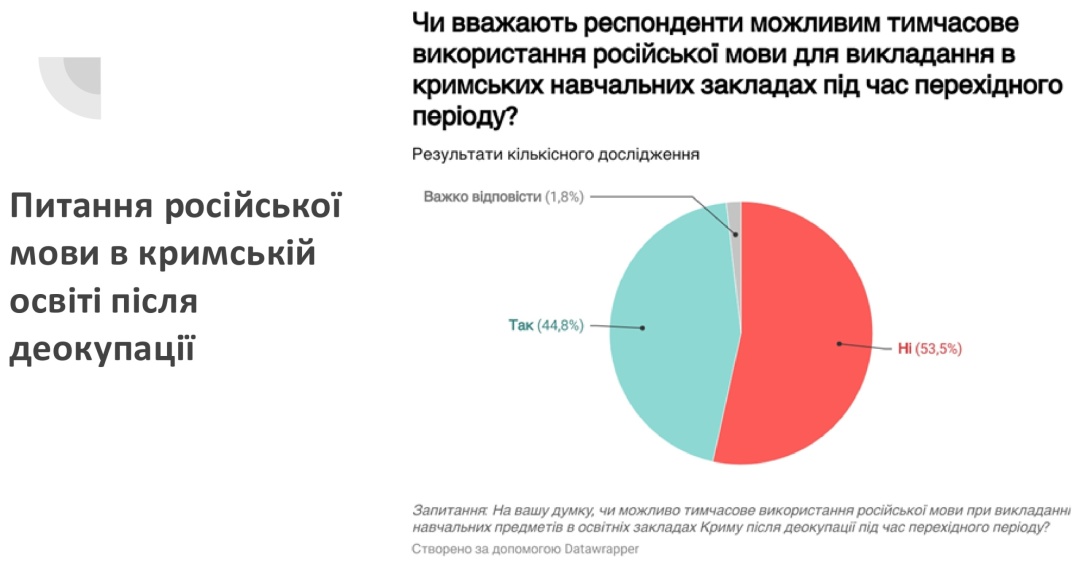 44,8% опитаних вважають можливим тимчасове використання російської мови для викладання в кримських навчальних закладах під час перехідного періоду, 53,5% виступають проти цього кроку. 1,8% не визначилися.