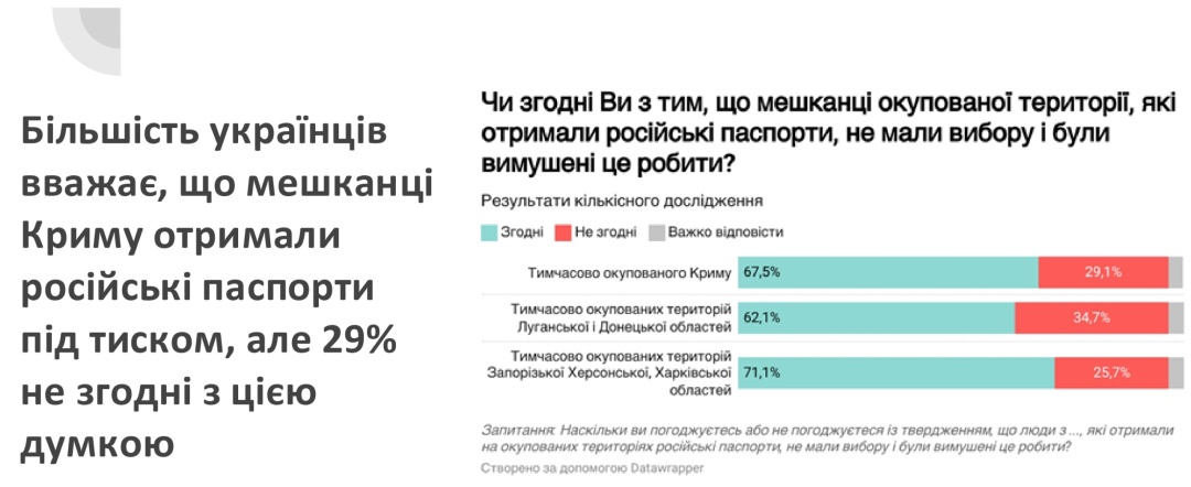 67,5% жителів материкової частини України вважають, що кримчан примушували отримувати російські паспорти, хоча багато з них насправді не хотіли цього. 29,1% дотримуються протилежної думки.