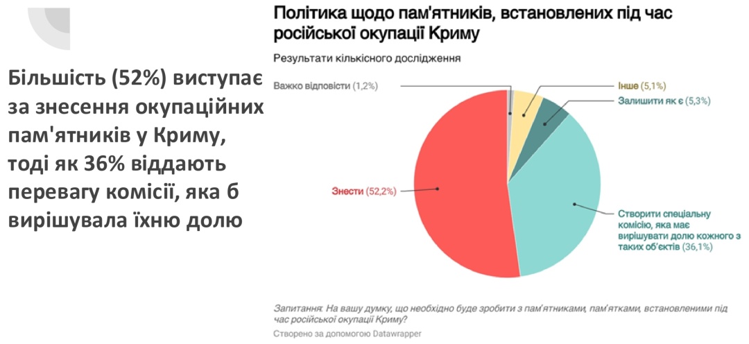 Більшість респондентів (52,2%) упевнені, що пам’ятники часів окупації, особливо колоніальні чи пропагандистські, мають бути демонтовані. 36,1% вважають, що необхідно створити спеціальну комісію, яка має вирішувати долю кожного з таких об’єктів. Залишити, як є, пропонують 5,3%. Іншу думку мають 5,1%, а 1,2% респондентів не визначилися у цьому питанні.