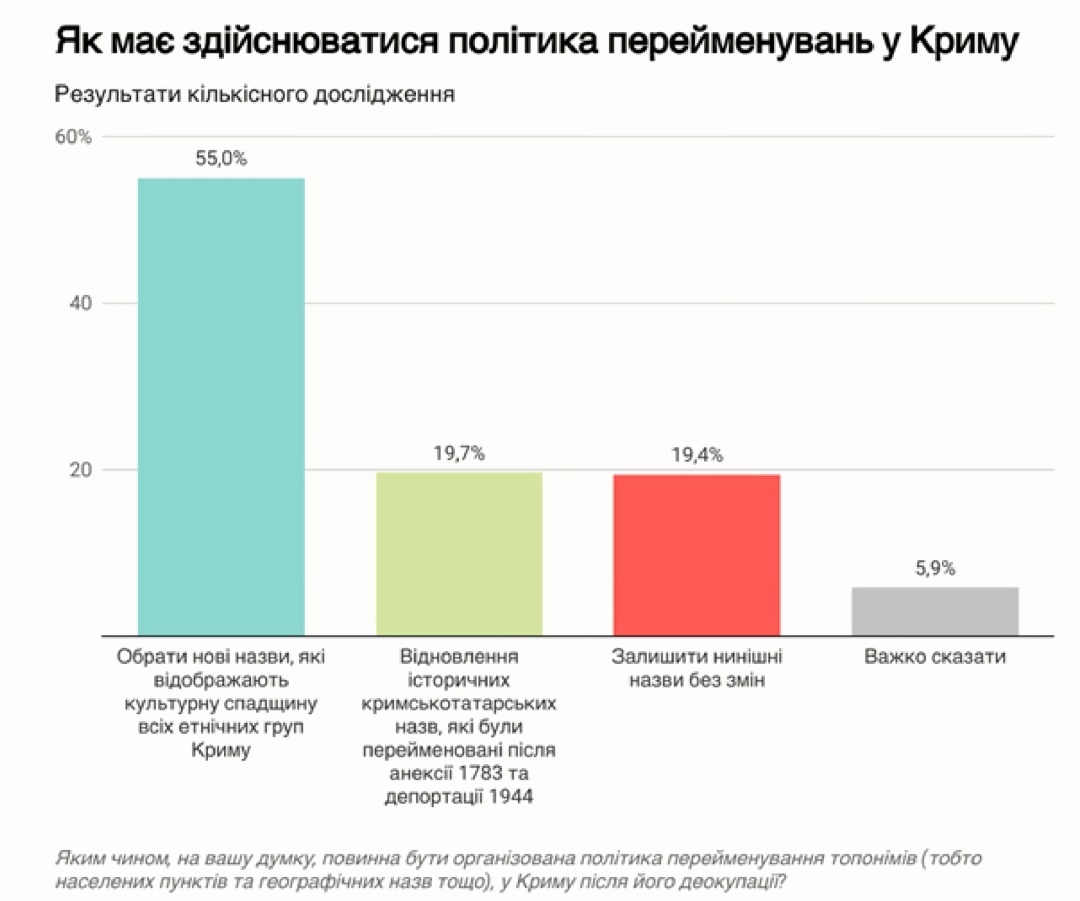 «У Криму поки що більшість українців (55%) вважають, що мають бути нові назви, які враховуватимуть все розмаїття півострова. Менша частина виступає за те, щоб повернути всі кримськотатарські назви. Тобто є розуміння, що символічний простір повинен бути змінений», – прокоментував соціолог.