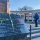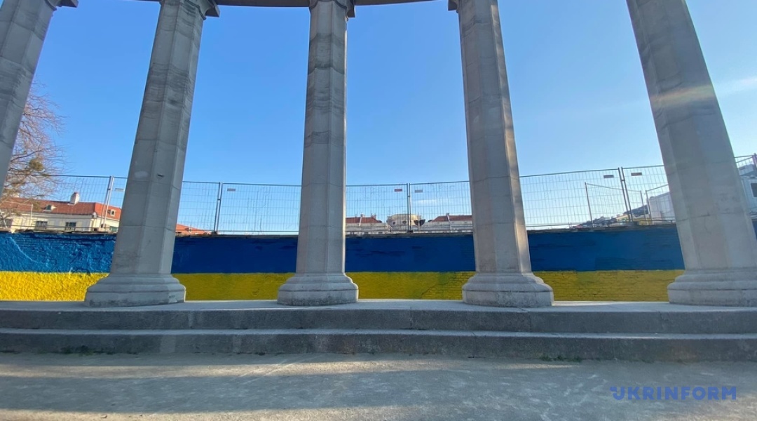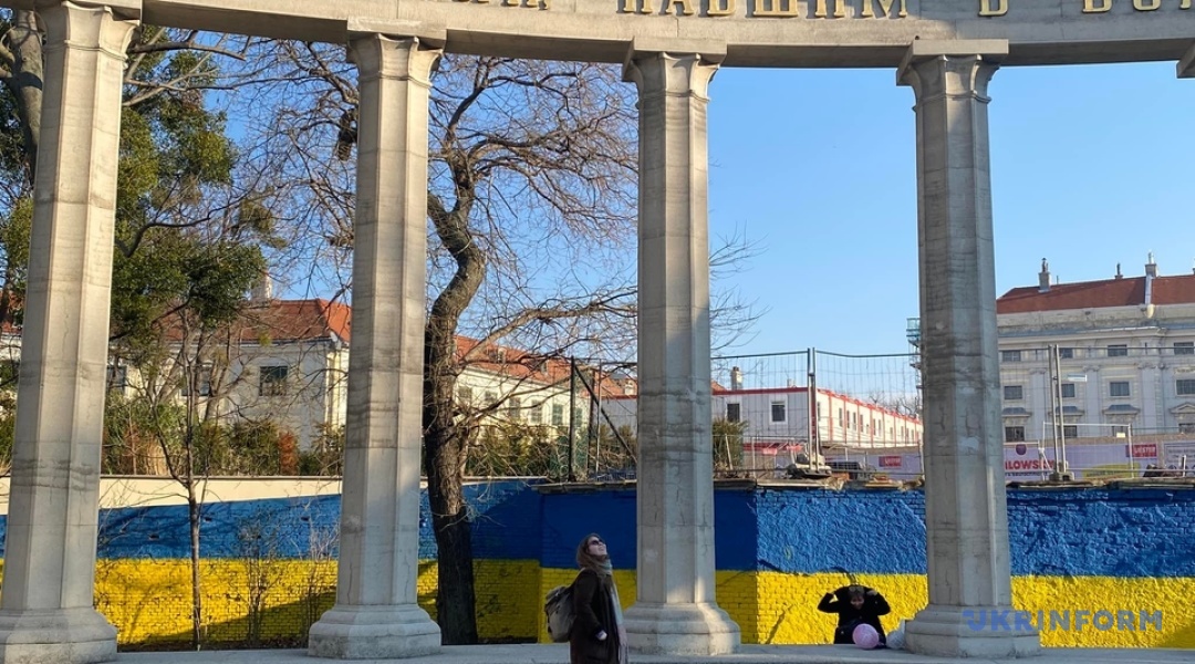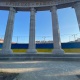 Яскраві синьо-жовті кольори з’явилися на стіні, розташованій за колонадою, на якій золотими літерами написано "Вічна слава героям Червоної армії, полеглим у боях з німецько-фашистськими загарбниками за свободу і незалежність народів Європи".