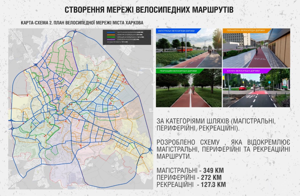 Концепція, розроблена фірмою “РС Інженерінг” на замовлення міського департаменту будівництва та шляхового господарства, передбачає облаштування близько 757 км веломаршрутів. Із них 349 км – магістральні, 272 км – периферійні, 127 км – рекреаційні. Зараз веломережа у Харкові складає лише близько 30 км, також є “стихійні” велошляхи, утворені велосипедистами в рекреаційних зонах.