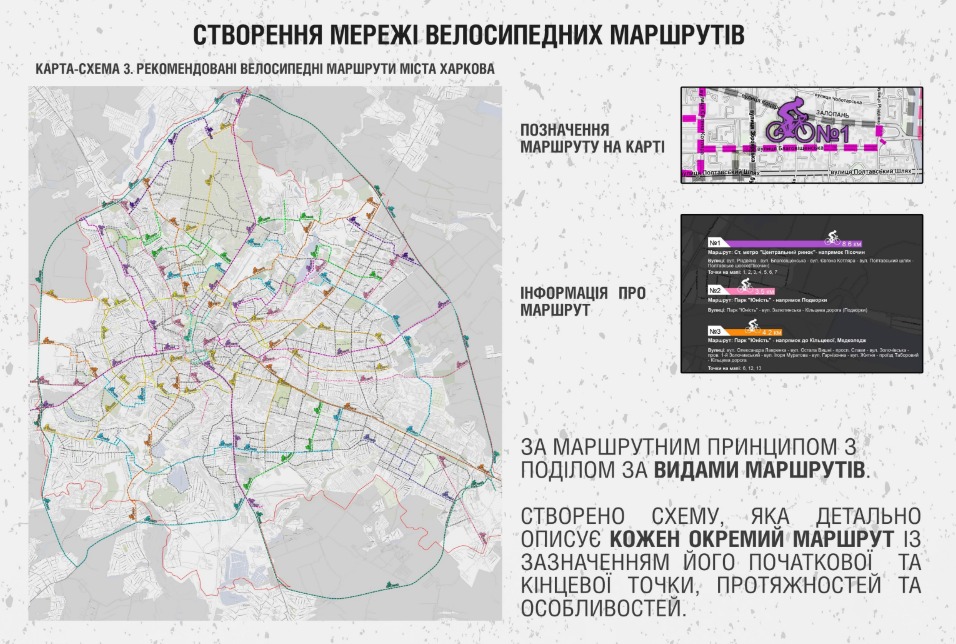 Розробники представили карти-схеми шляхів із урахуванням основних центрів тяжіння жителів. За задумом, велосипедна мережа має бути інтегрована у транспортну систему міста (облаштування велопарковок, можливості проїзду з велосипедом у транспорті, розміщення місць сервісу та велопрокату).