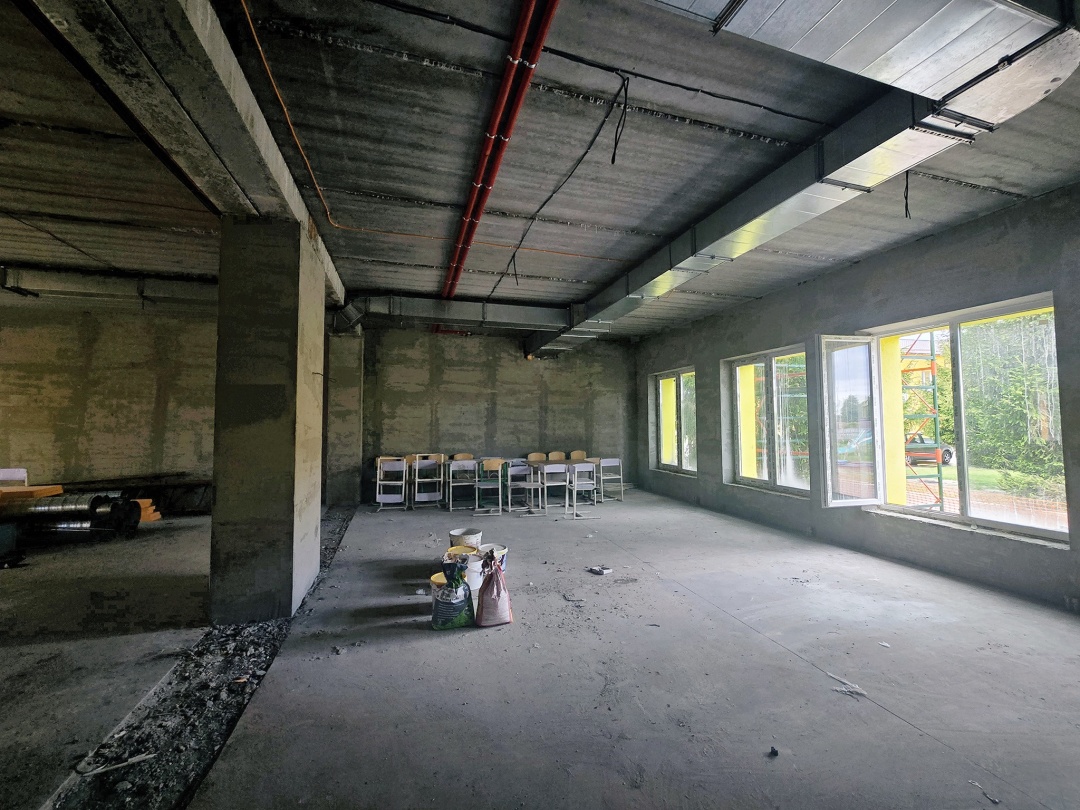 Наразі будівельники влаштовують вимощення навколо будівлі та парапет на даху. Найближчим часом мають розпочати тинькування стін всередині будівлі.