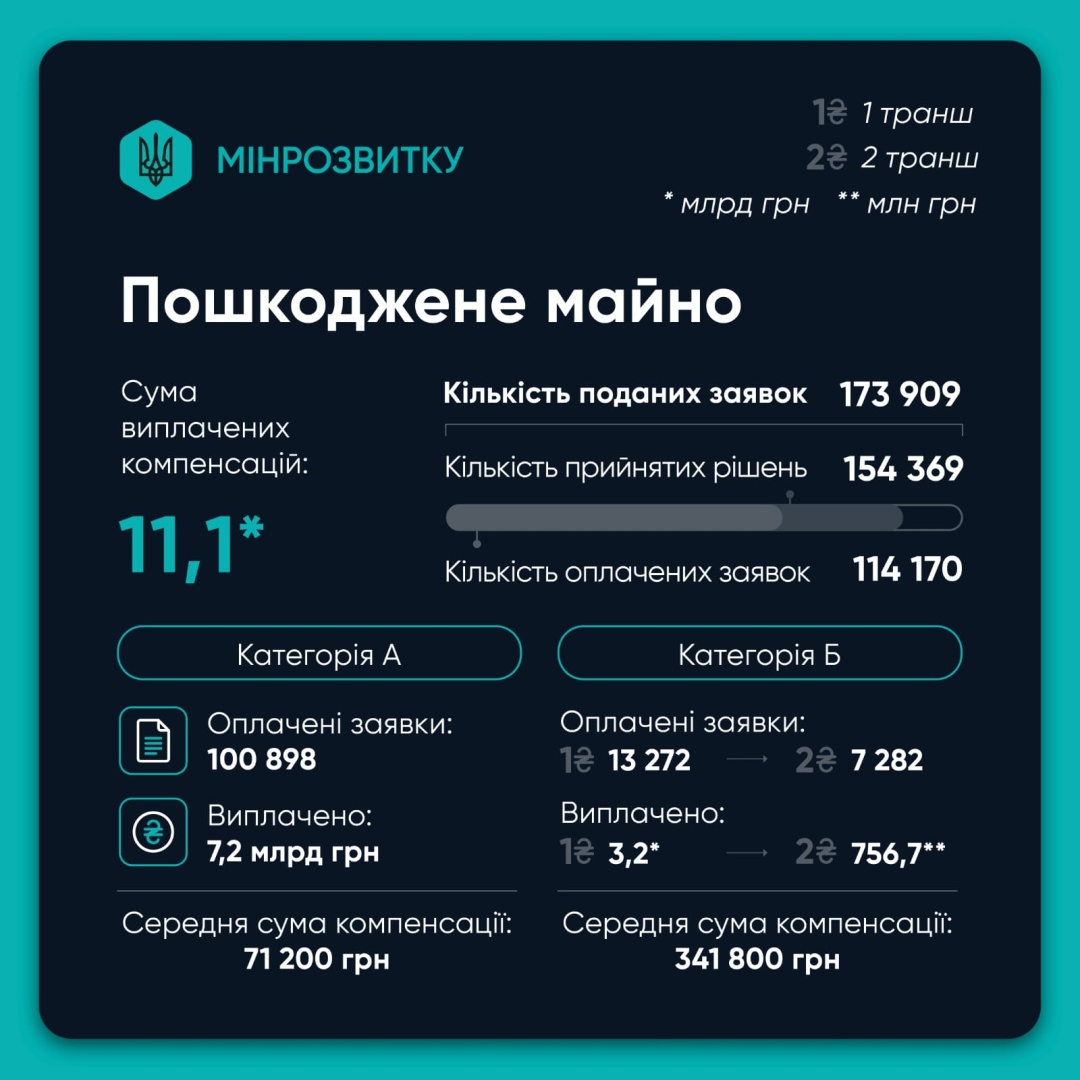 За даними міністерства, за пошкоджене майно для понад 114 тис. родин виплачено 11,1 млрд грн, з яких 7,2 млрд грн – виплати за дрібні ремонти (категорія А), 3,2 млрд грн – за капітальні. Середні суми компенсацій становили 71 200 грн та 341 800 грн відповідно.
