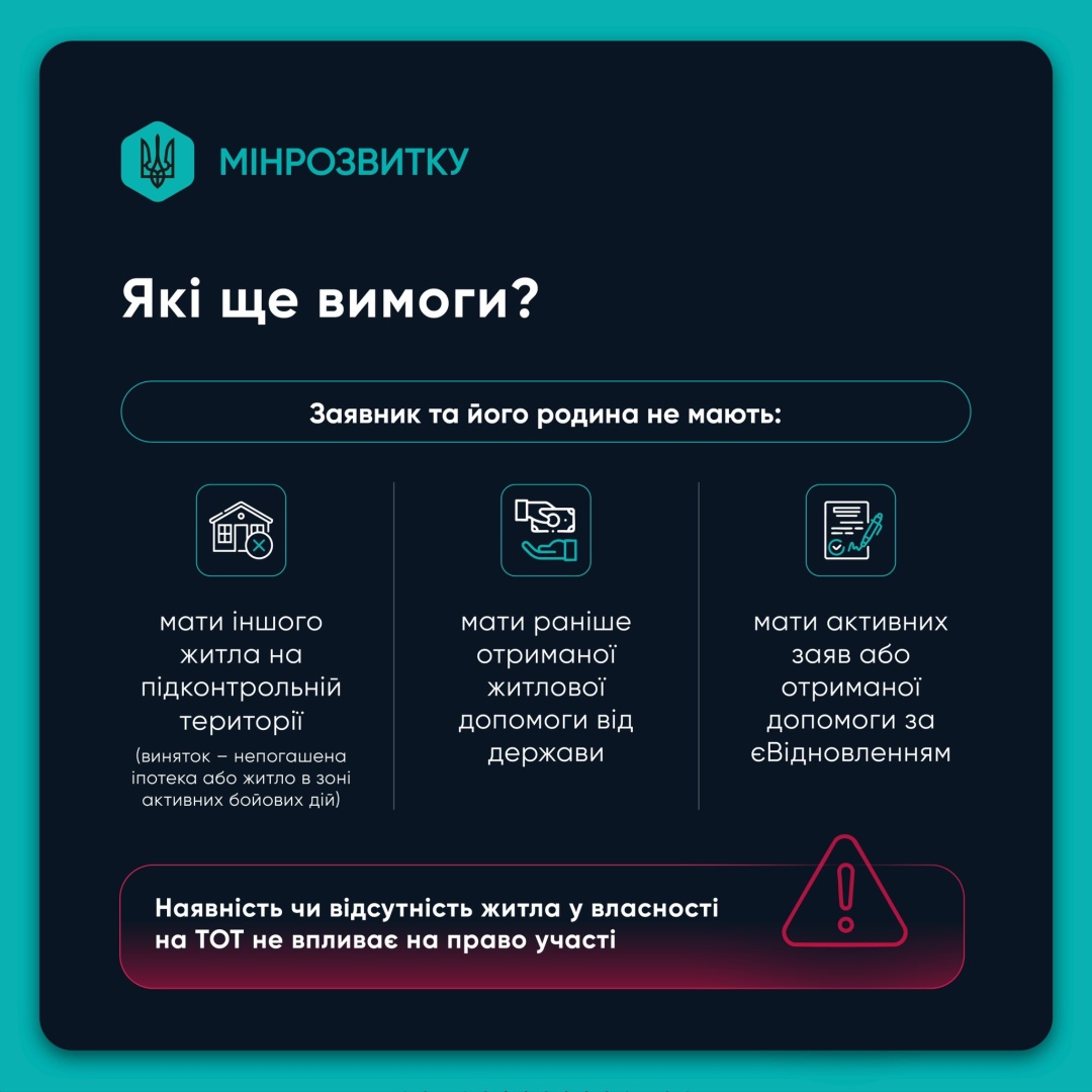 Участь в програмі можлива, якщо заявник та його родина (чоловік/дружина і неповнолітні діти) не володіють іншим житлом на підконтрольній Україні території, за винятком випадків непогашеної іпотеки або житла в зоні активних бойових дій. Участь можлива також за умови, що родина не отримувала житлову підтримку в інших програмах і не має чинних заяв у «єВідновленні».