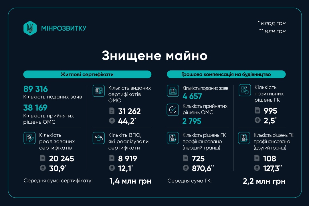 Також понад 31,2 тис. родин отримали житлові сертифікати для придбання житла замість знищеного на загальну суму 44,2 млрд грн. Загальна кількість поданих заяв за весь час – понад 89 тис. При цьому вже придбали нове житло понад 20,2 тис. сімей. З них майже 8 тис. – це родини внутрішньо переміщених осіб.