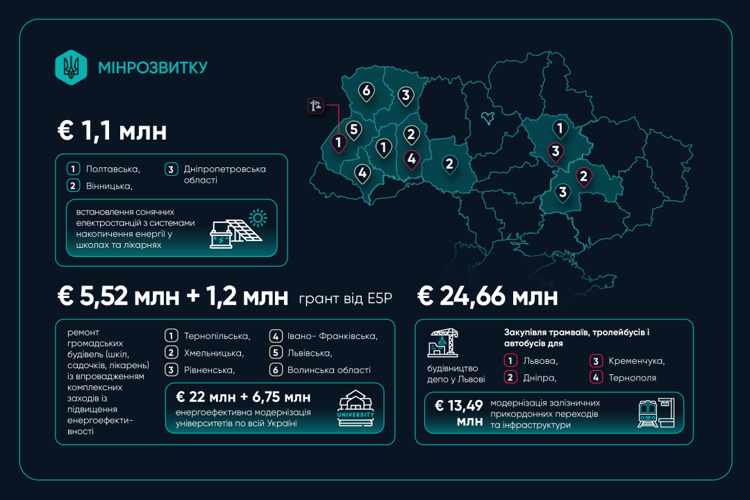 Зазначається, що кошти будуть спрямовані на проєкти у Львівській, Дніпропетровській, Полтавській, Вінницькій, Тернопільській, Хмельницькій, Рівненській та Івано-Франківській областях.