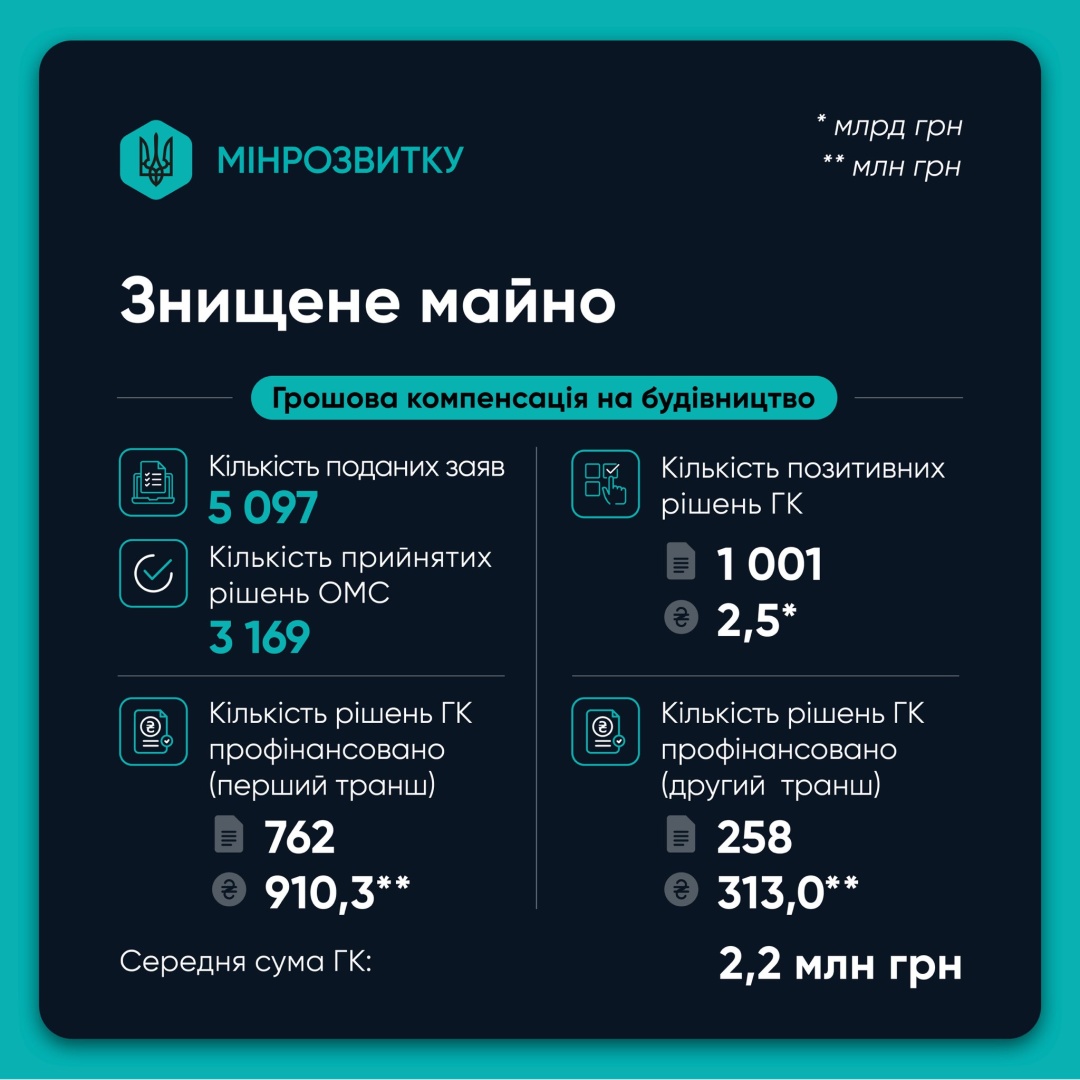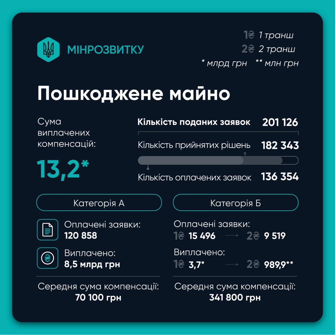 Зокрема, за пошкоджене житло кошти отримали понад 136,4 тисячі родин. Загальна сума виплат сягнула 13,2 млрд гривень. Ці кошти призначені за дрібні та капітальні ремонти, середня сума виплат становить 70100 грн та 341800 грн відповідно.
