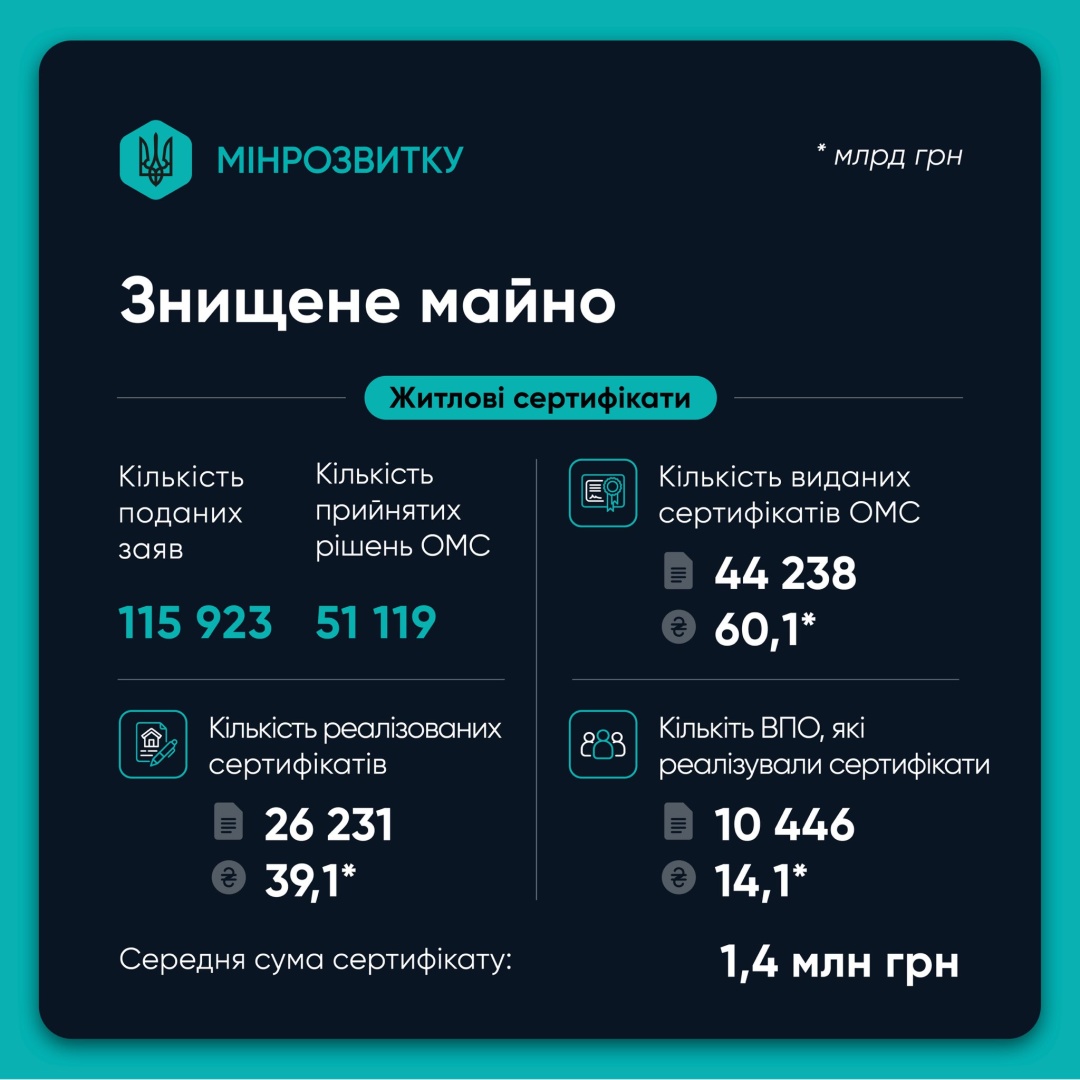 За знищене житло компенсації отримали понад 44,2 тисячі родин. Їм надані сертифікати на придбання нового житла замість знищеного на загальну суму 60,1 млрд гривень.