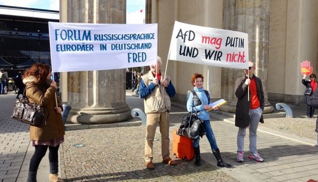 Також на акції були присутні представники Форуму російськомовних європейців, які тримали плакат: "АдН любить Путіна, ми – ні". "Ми, російськомовні громадяни ФРН, обурені тим, що представники путінських владних структур говорять від нашого імені", - заявили учасники акції. Вони з жалем констатували, що багато німецьких медіа схильні не бачити відмінностей між російськомовними громадянами Німеччини і "путінськими симпатиками", тоді як у реальності багато хто з них, якщо не більшість, є прихильниками європейських цінностей.