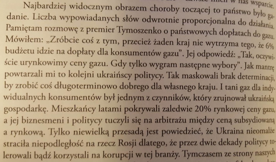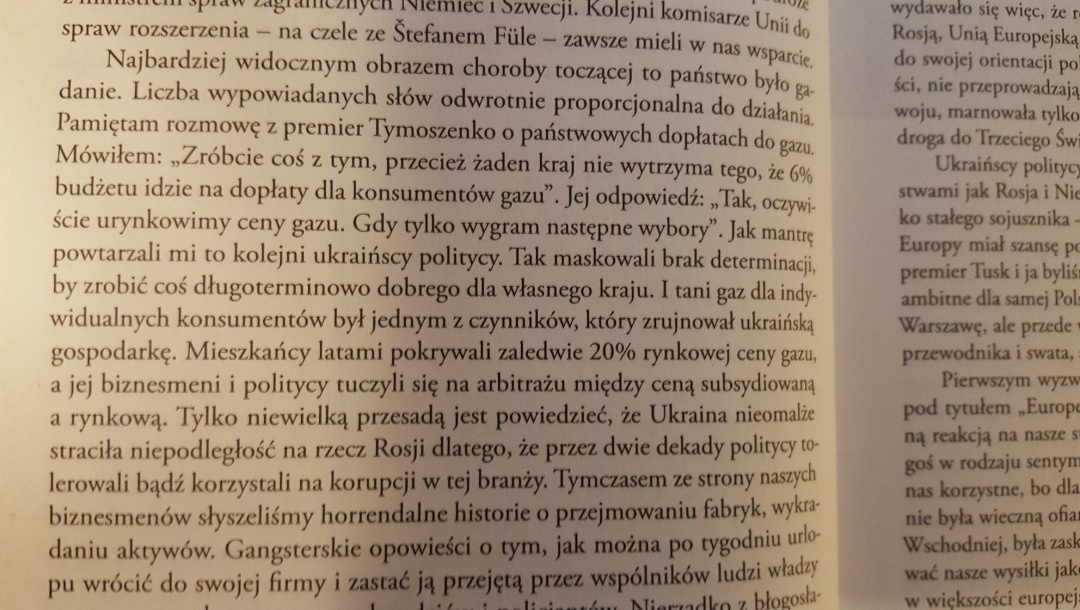 Чтива достатньо – 400 сторінок, але перший розділ він починає з України. Не дивно, бо найбільшим своїм успіхом Сікорський вважає місію “20 лютого”, коли разом зі Штайнмайєром та Фабіусом він переконав Януковича підписати документ, який де-факто втратив силу ще того самого дня разом із втечею “гаранта”. Так от, в українському питанні він досить цікаво описує своє бачення політичної системи України, олігархів, “волинської” проблематики, підтримки Польщею України на Заході. Як на мене, дуже цікаво, навіть з метафорами, він звертає увагу на “хвороби” українського політичного класу – надмірний україноцентризм і популізм. Так от, він вважає, що Україна у період його перебування при владі мала яскраво виражений “комплекс малої дитини” (kompleks bobasa), яка вважає, що оскільки дорослі приділяють їх багато часу, то вона дуже важлива.