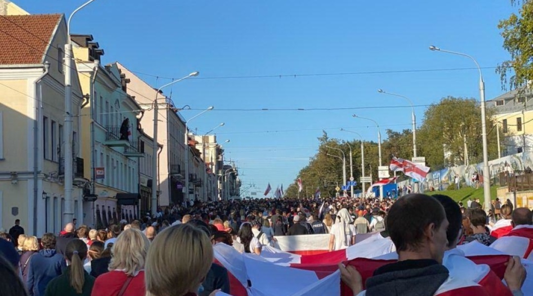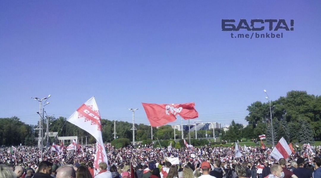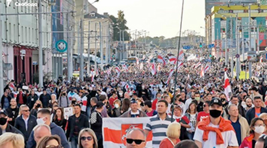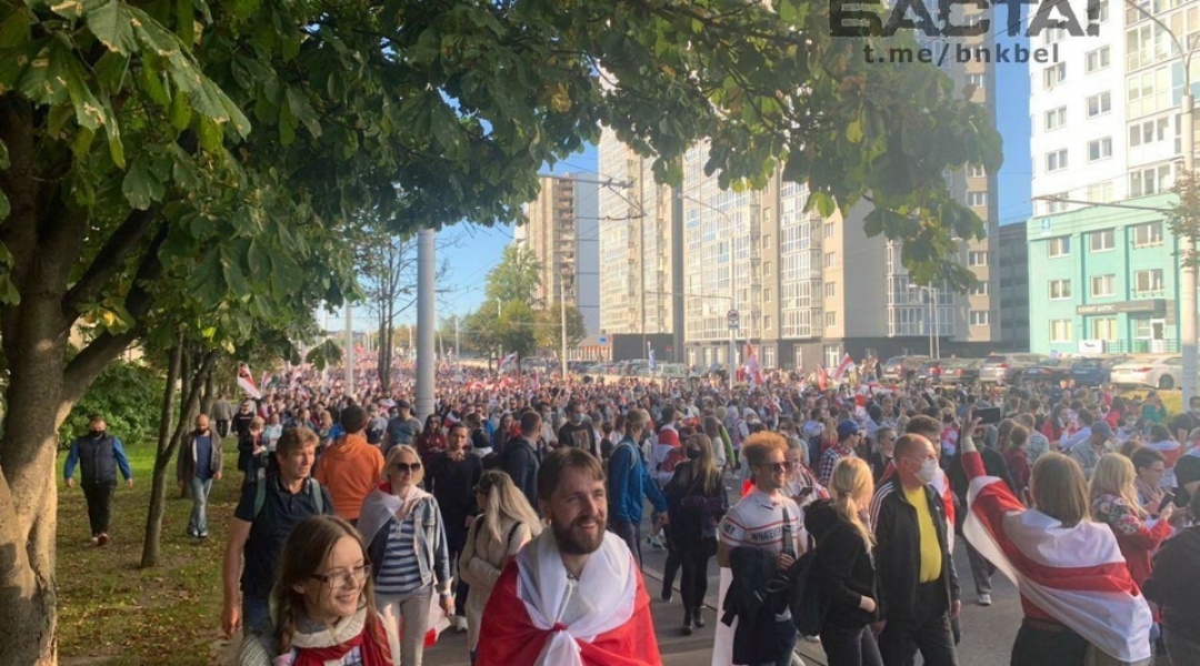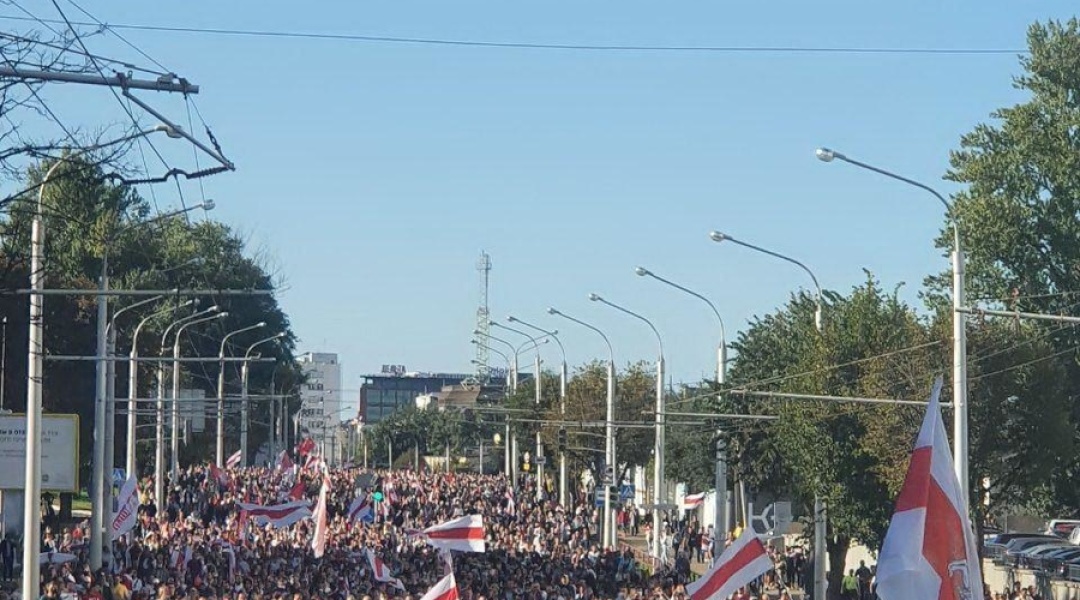 Понад 100 тисяч осіб пройшли ходою вулицями Мінська у неділю шостий вікенд поспіль, протестуючи проти фальсифікації результатів президентських виборів у Білорусі, переможцем яких Центрвиборчком країни оголосив Олександра Лукашенка. Учасники акції протесту вимагали відставки нинішнього президента країни.