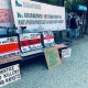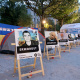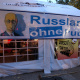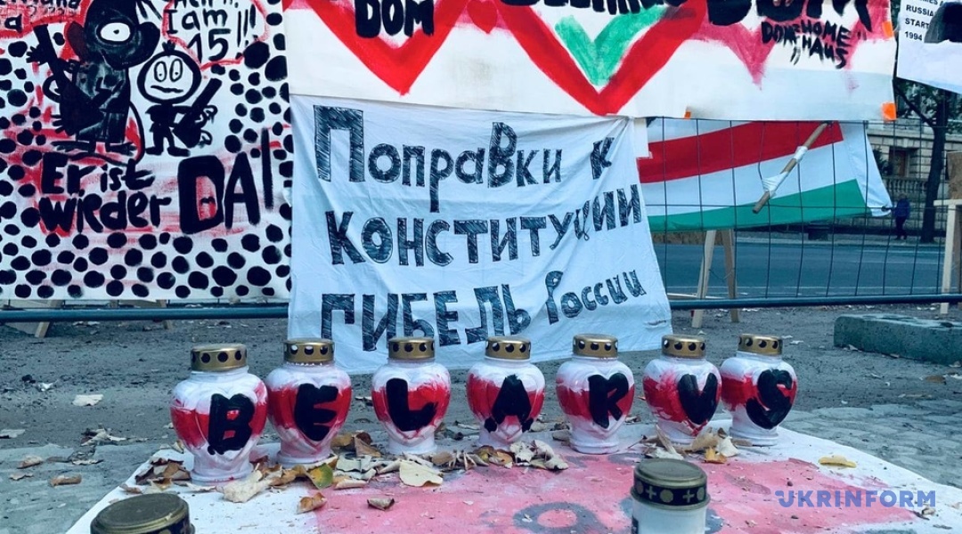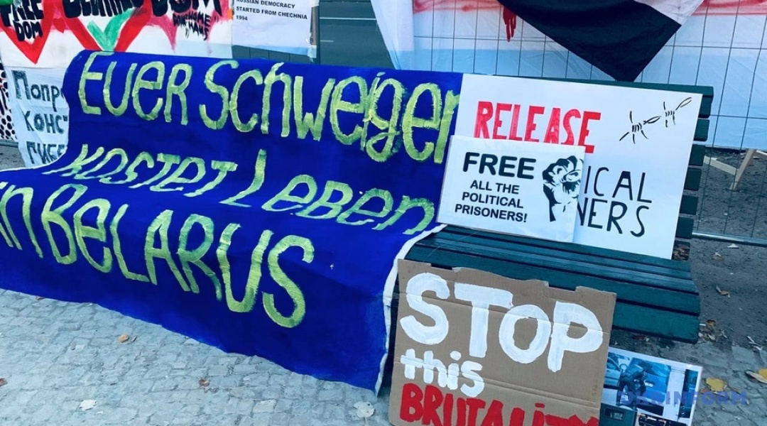 На майданчику, у «протестному наметовому містечку» багато фото, плакатів, прапорів, самовар з написом «Новічок». На великому наметі перераховано теми, які повинні бути не байдужими для європейців, адже підривають безпеку і демократію: російська пропаганда, дестабілізація, підтримка крайніх лівих і крайніх правих, втручання у вибори, корупція, розв’язання війни в Україні, втручання у внутрішні справи Білорусі, створення кризи біженців через підтримку війн у Сирії та Лівії.