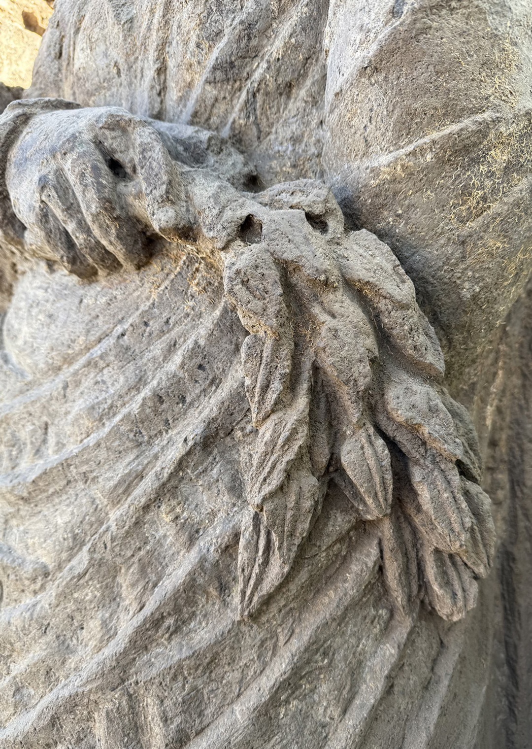 Статуя жінки тримає в руках щось схоже на лаврове листя, яке використовувалося для освячення релігійного простору.
