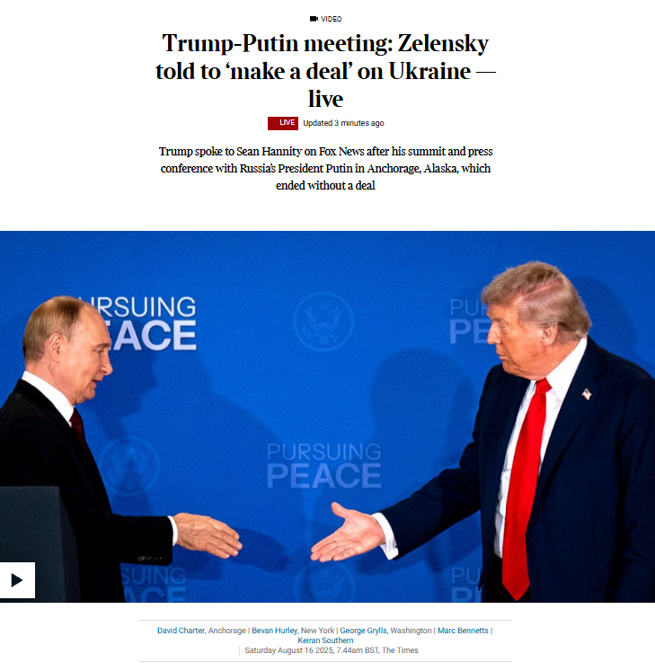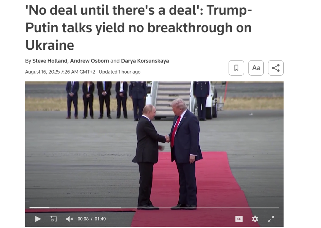 Саміт був організований з властивою Трампу помпезністю: червоні килими, проліт стратегічних бомбардувальників, військовий урочистий прийом. Але, як відзначають міжнародні медіа, за зовнішнім блиском ховалася порожнеча: ні припинення вогню, ні плану миру, ні конкретних домовленостей. Від Вашингтона до Лондона, від Нью-Делі до Катара преса підкреслює: зустріч стала радше видовищем, аніж кроком до миру.