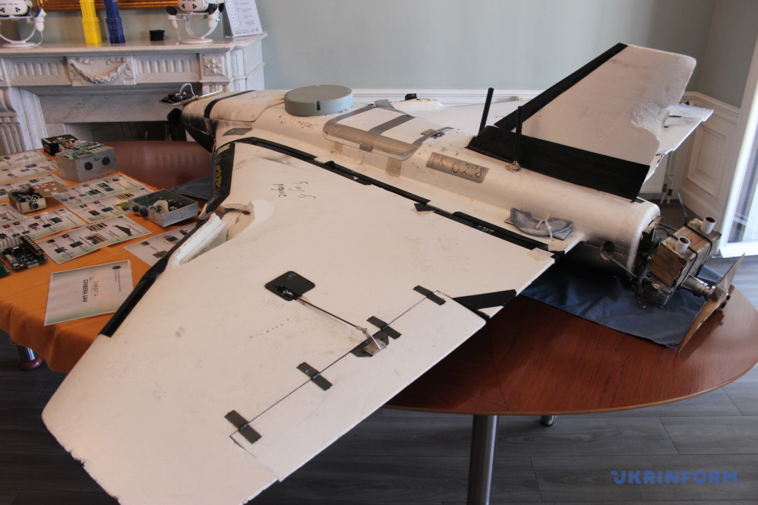 Поряд із російськими дронами «Шахед» і «Гербера» у посольстві старша дослідниця Незалежної антикорупційної комісії (НАКО) Вікторія Вишнівська розклала ще понад 40 експонатів, серед яких чипи, мікросхеми, двигуни тощо.