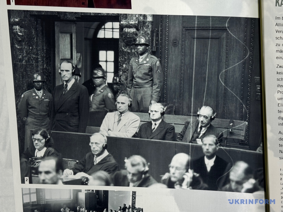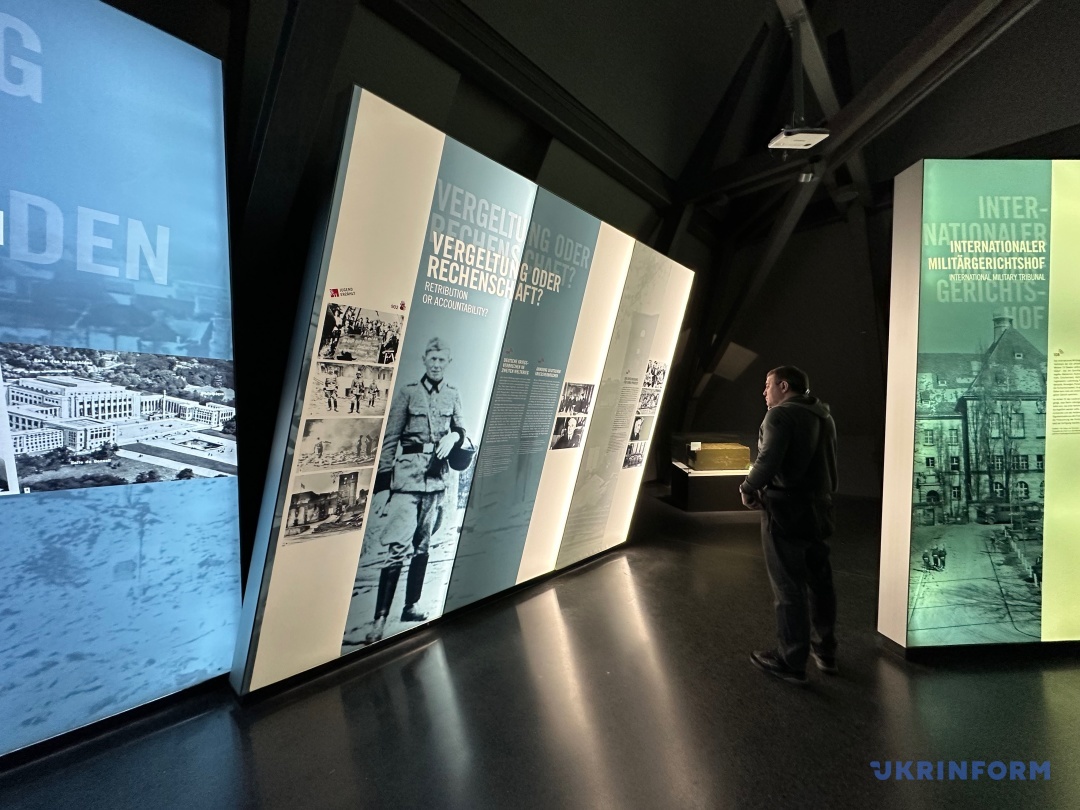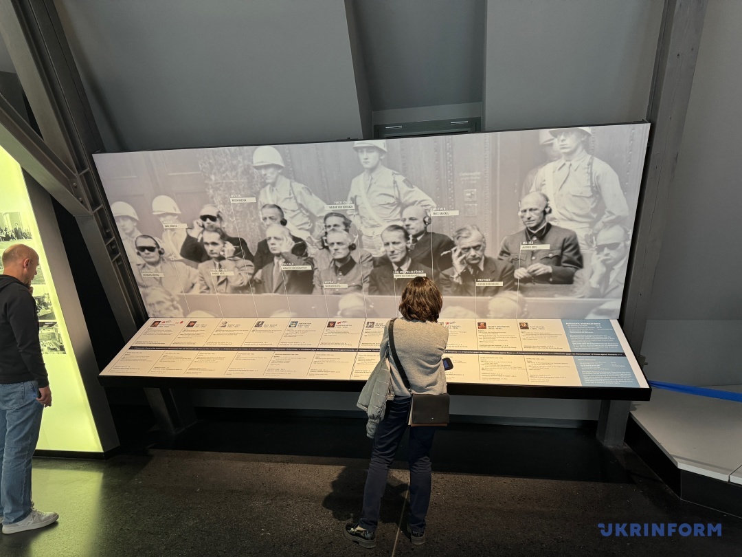 Експозиція музею, не дуже велика, та 20-хвилинне відео, яке показують у знаменитій Залі суду №600, де власне й проходили засідання, – це архівні матеріали, які стосуються не лише того трибуналу, а й наступних процесів після Другої світової. Але не тільки: тут представлена інформація і про вплив Нюрнберзького трибуналу до сьогодні, зокрема, про відносно недавні суди над тими, хто скоїли злочини проти людяності по всьому світу. Важливо, що у відео вже є згадка про російську війну в Україні. «Кожна атака, кожне бомбардування є злочином агресії. Володимир Путін має бути притягнутий до відповідальності за звірства, скоєні російськими військами в Україні. Така поведінка потребує воєнного трибуналу на кшталт Нюрнберзького», – лунає у судовій залі. Поки що з велетенського екрана. Хочеться сподіватися, що одного дня в музеї з’явиться ще один повноцінний стенд.