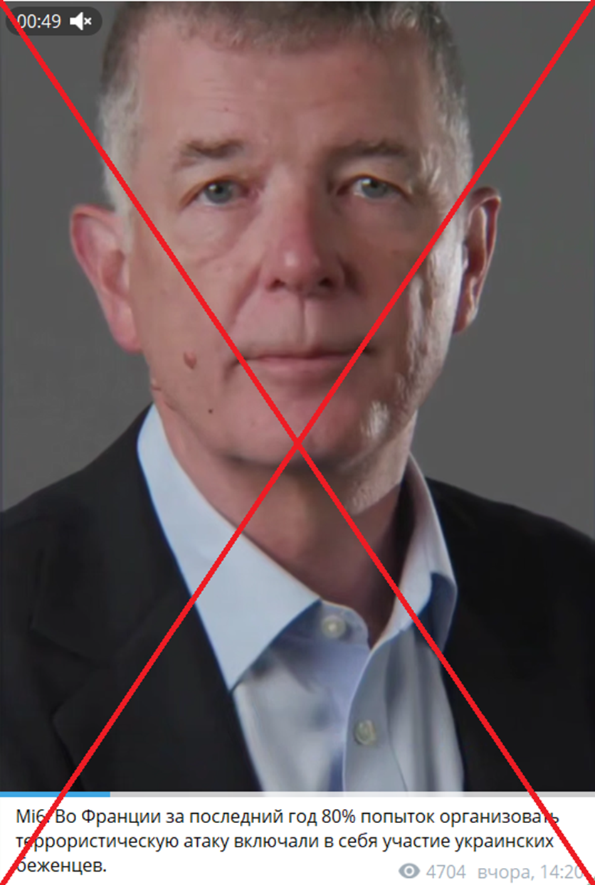 Російські телеграм-канали поширюють відео від імені британської служби зовнішньої розвідки MI6. У ролику представник відомства нібито зазначає, що торік у Франції українські біженці були причетні до 80% спроб організації терористичних атак. Стверджується, що через «дії» українців за кордоном під загрозою буцімто опинились всі країни Європейського Союзу та Велика Британія.