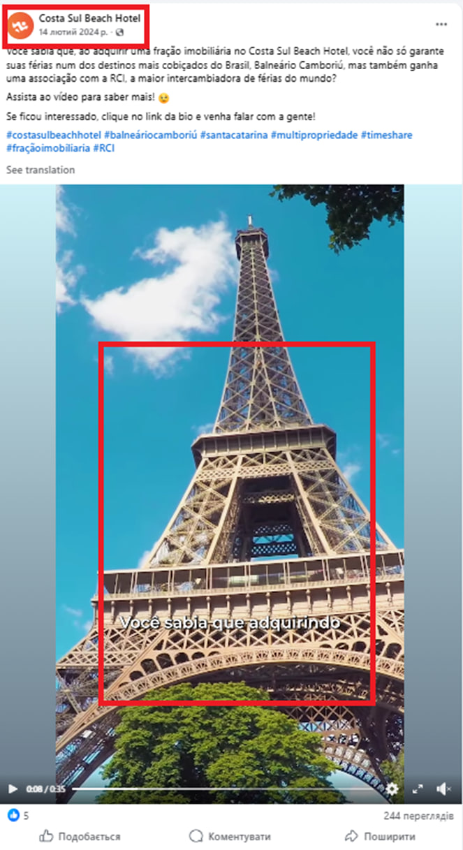 Натомість фейковий фрагмент ролика, у якому йдеться про нібито «українську» терористичну діяльність, складається з набору непов’язаних між собою фото та відео. Його додали до оригінального ролика за допомогою відеоредактора. Більшість цих матеріалів не стосуються Франції, на якій акцентують увагу пропагандисти РФ. Зокрема, кадри з Ейфелевою вежею взяті з рекламного ролика бразильської туристичної компанії, а зображення масового зібрання українців — це фото з мітингу в Мадриді в березні 2022 року.