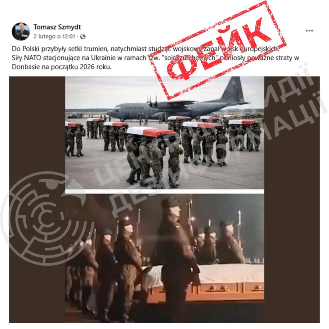 «Колишній польський суддя Томаш Шмидт, який перебуває в розшуку за підозрою у шпигунстві на користь Білорусі та отримав білоруське громадянство, опублікував у Facebook допис із фотографіями трун, стверджуючи, що «до Польщі прибули сотні тіл», а сили НАТО в межах Коаліції охочих нібито зазнали великих втрат на Донбасі на початку 2026 року», - йдеться в повідомленні.